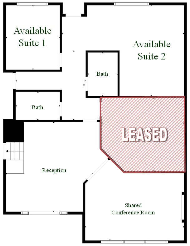 Notes: Ground floor suites with on-site parking, private office(s), open work spaces, and access to shared restrooms and optional shared Conference Room. Excellent freeway access and a short walk to the downtown core. Suite 1: 10′ x 12′ and Suite 2: 17′ x 23′